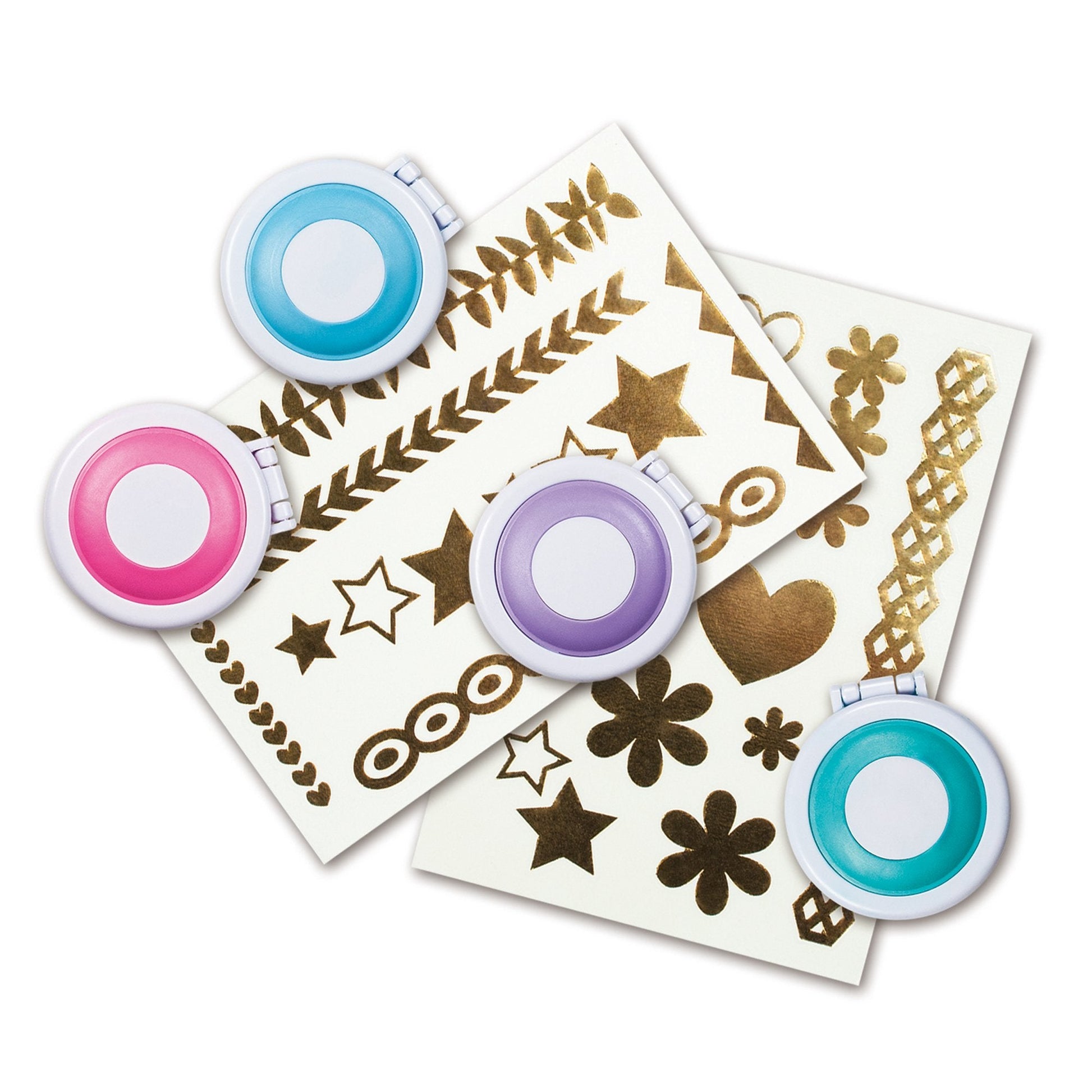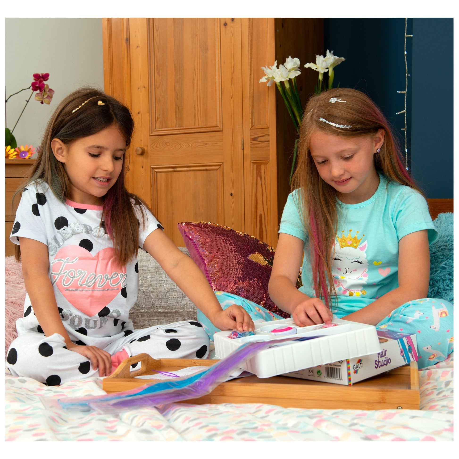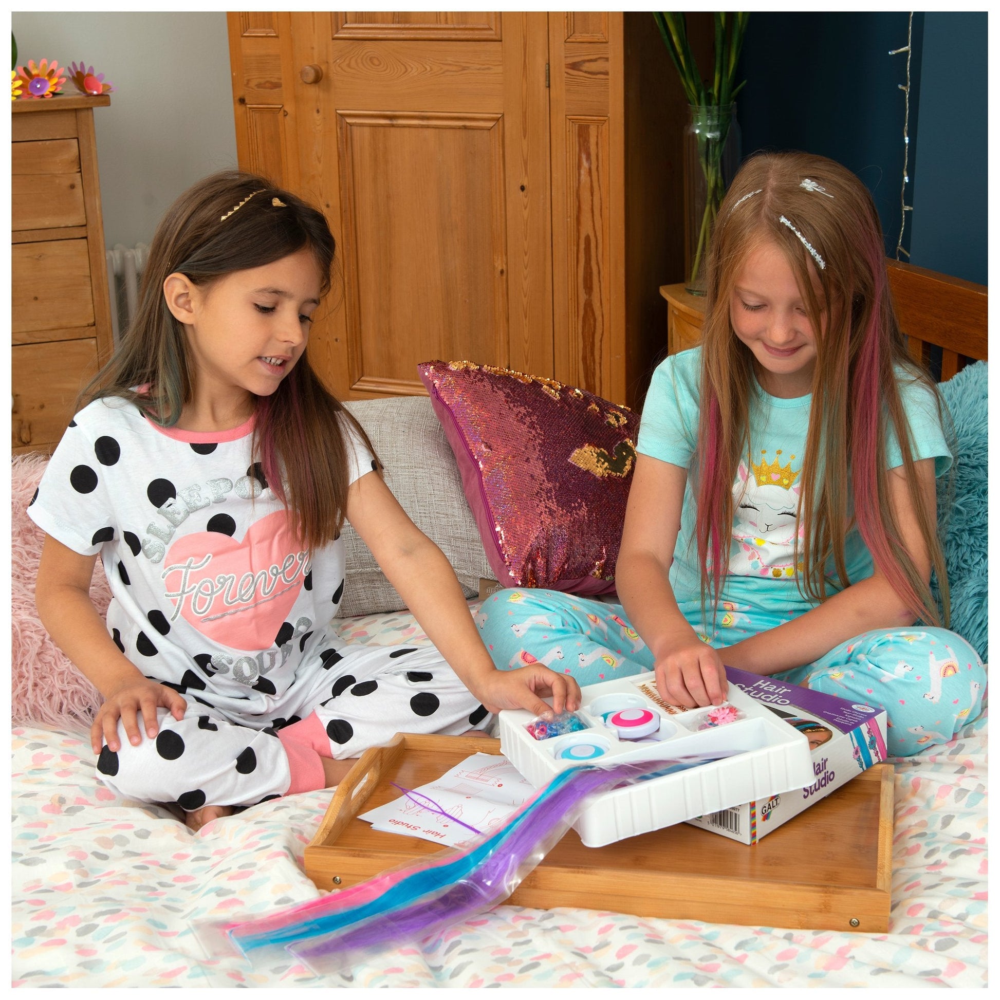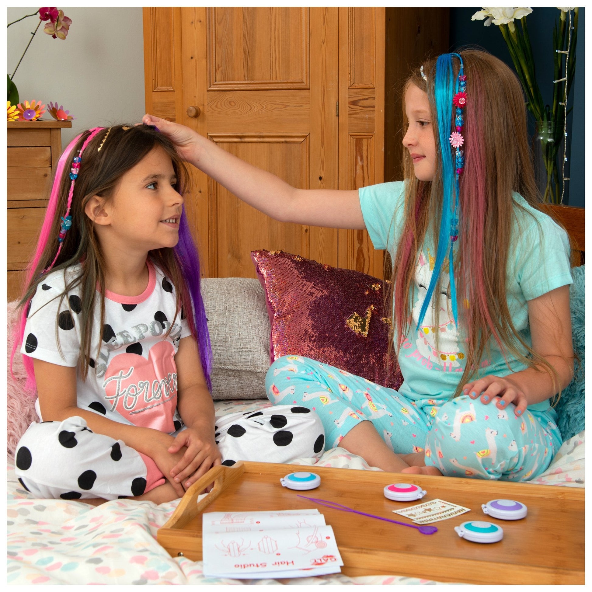 Make and wear plaited hair extensions with beads and flowers. Add coloured highlights with the hair chalk compacts and decorate with the metallic hair tattoos. Ideal for parties, sleepovers and festivals!